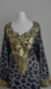 Embrace timeless elegance with this stunning Arabian Makhaweer dress. This captivating piece features a luxurious leopard print fabric in sophisticated shades of gray and black, offering a bold yet refined aesthetic. It's beautifully adorned with intricate hand-embroidered gold detailing around the neckline and cuffs. The flared sleeves contribute to a flowing, graceful silhouette, perfect for both formal events and special occasions.